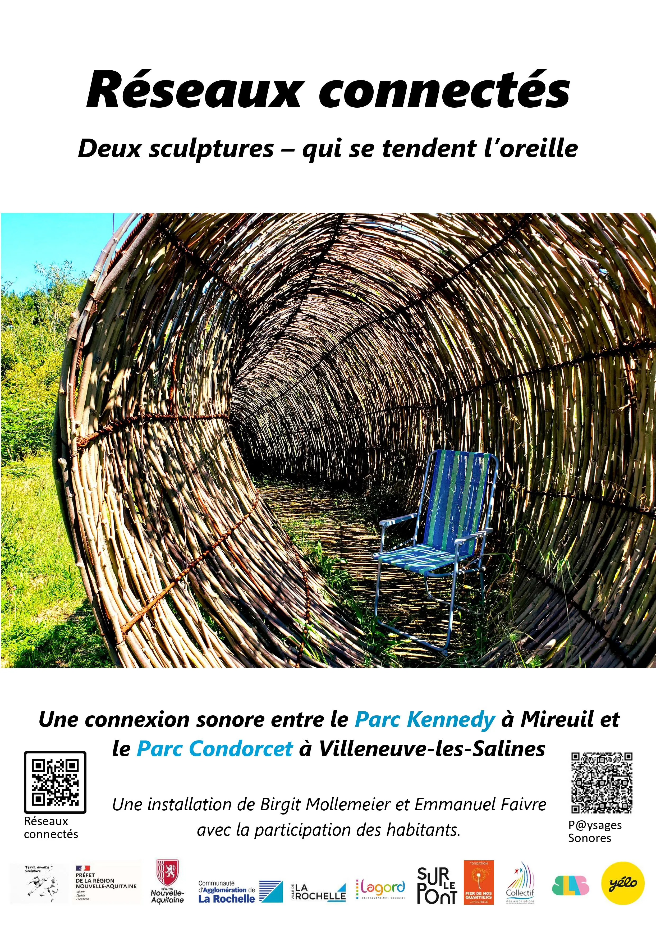 11 mars – 30 novembre 2024 au parc Kennedy à Mireuil, 02 avril – 30 novembre 2024 au parc Condorcet à Villeneuve-les-Salines Projet d’art participatif : Installation immersive, sonore et inter-connectée au Parc Kennedy et au parc Condorcet à La Rochelle